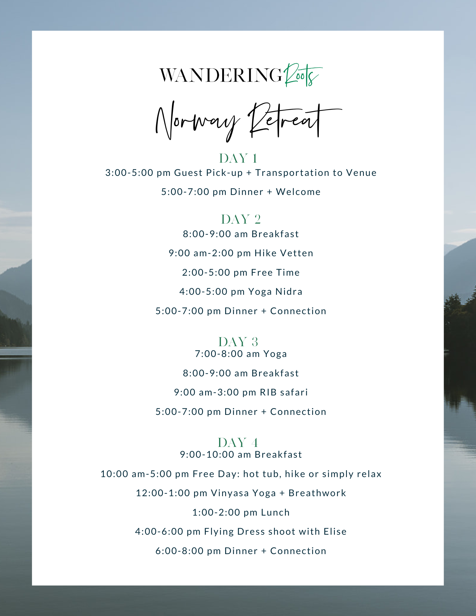Once we receive your registration, we’ll send you a welcome email to map out what to expect over the next few months leading up to the retreat. You will also receive a checklist of what exactly to pack, reassurance that it’s ok to still overpack, details on what to expect on excursions and verification there is a bathroom at the hiking trail for when you just drank an entire pot of coffee.